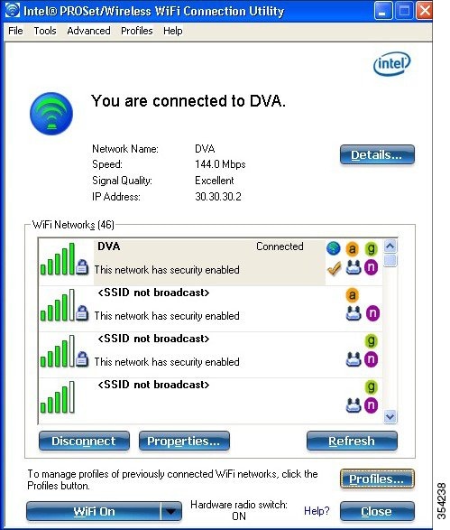 Connect to the DVA WLAN with Student Group, and review the client WiFi Connection Utility. ![]() |