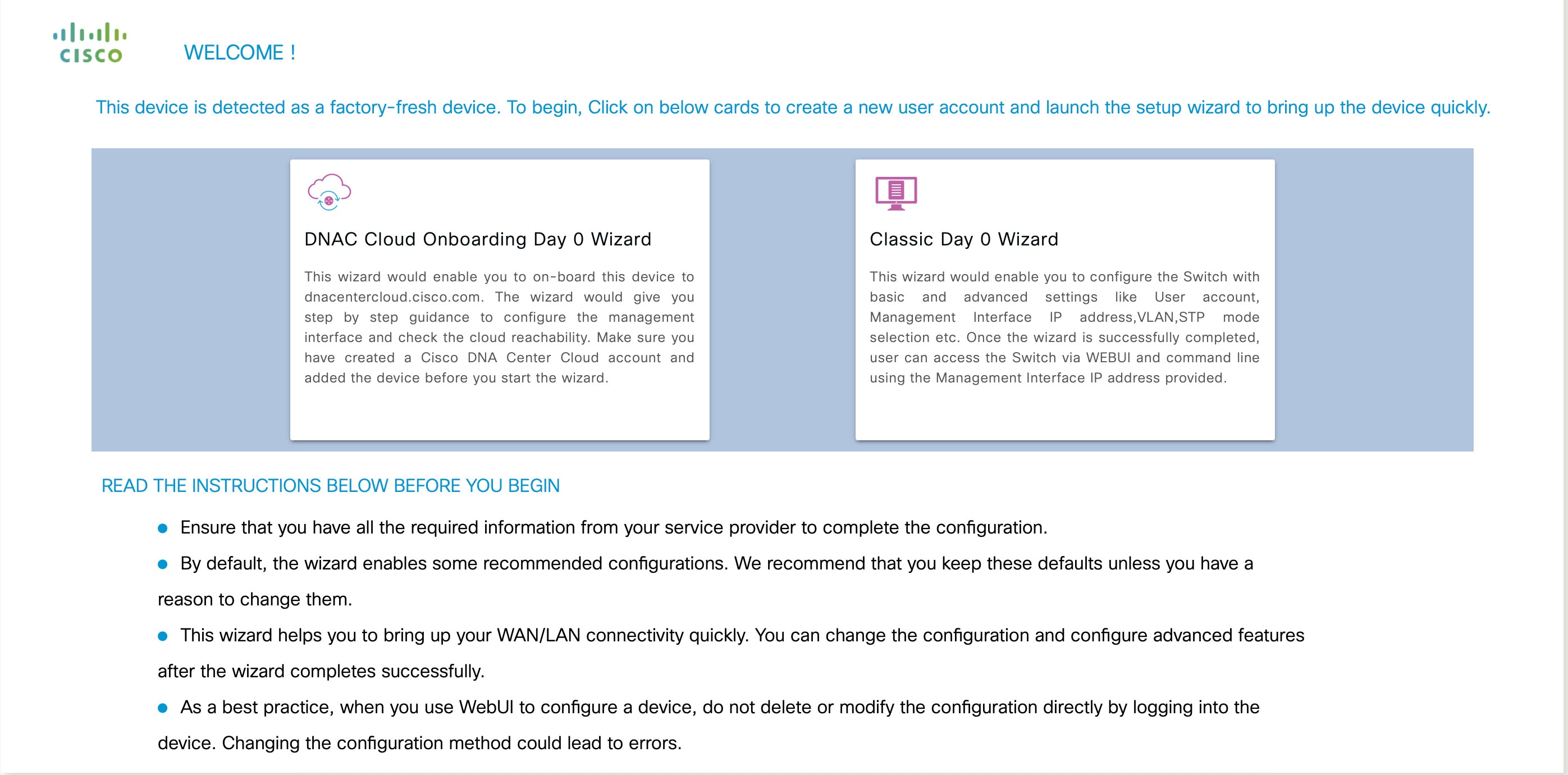 If your network is managed by Cisco Meraki, then the switch will be automatically detected and onboarded to the network. You are not required to configure the Web UI in this case. |