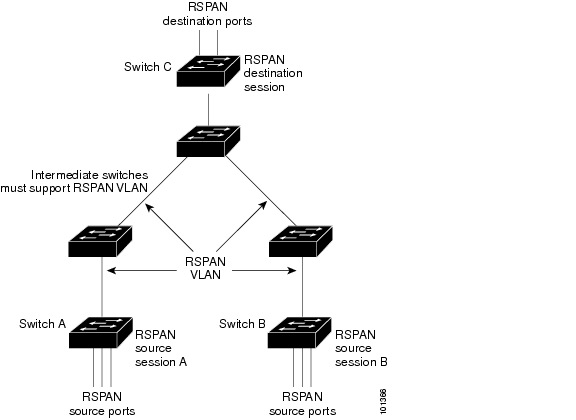 There can be more than one source session and more than one destination session active in the same RSPAN VLAN. There can also be intermediate switches separating the RSPAN source and destination sessions. These switches need not be capable of running RSPAN, but they must respond to the requirements of the RSPAN VLAN (see the "RSPAN VLAN" section).