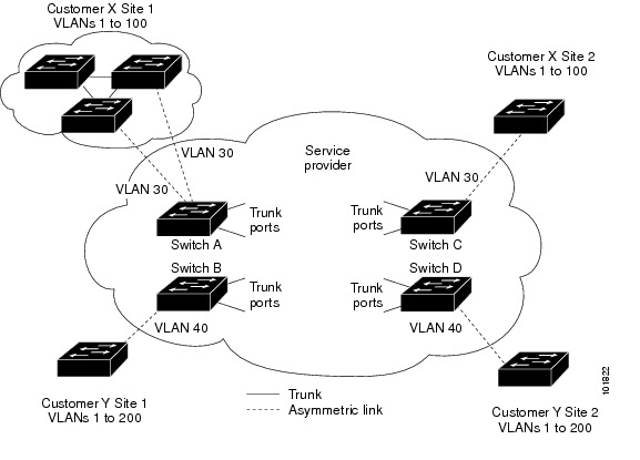 Customer traffic tagged in the normal way with appropriate VLAN IDs comes from an 802.1Q trunk port on the customer device and into a tunnel port on the service-provider edge switch. The link between the customer device and the edge switch is asymmetric because one end is configured as an 802.1Q trunk port, and the other end is configured as a tunnel port. You assign the tunnel port interface to an access VLAN ID that is unique to each customer. See Figure 17-1.