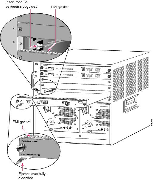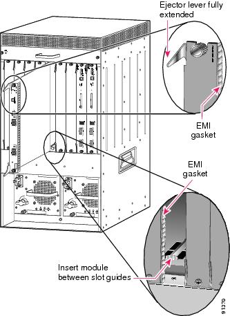 Carefully slide the module into the slot until the EMI gasket along the right edge of the module makes contact with the module in the slot adjacent to it and both ejector levers have closed to approximately 45 degrees with respect to the module faceplate. (See Figure 9.)