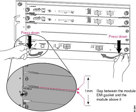 Using the thumb and forefinger of each hand, grasp the two ejector levers, and press down to create a small 0.040 inch (1 mm) gap between the module's EMI gasket and the module above it. (See Figure 7.)