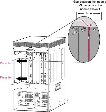 If the captive installation screws are loose, the EMI gaskets on the installed modules will push adjacent modules toward the open slot, reducing the opening size and making it difficult to install the removed module.