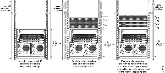 Figure 1 shows three different installation scenarios using a Catalyst 6506 switch with two WS-X6148X2-RJ-45 Ethernet modules and two splitter patch panels: