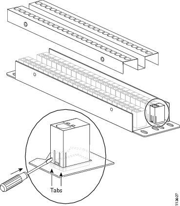 Using a small flat-blade screwdriver, press in on the two tabs, shown in Figure 3, to release the individual cable splitter, and carefully remove the individual cable splitter from the panel.