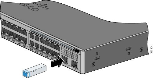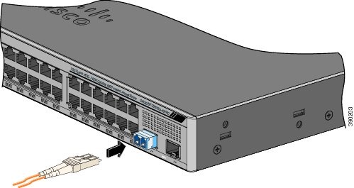 | Step 2 | Insert one end of the fiber-optic cable into the SFP or SFP+ module port. |