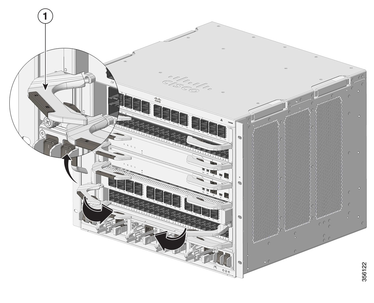 Pivot both the ejector levers inward simultaneously. Make sure that you pivot the ejector levers of C9600-LC-40YL4CD, C9600X-LC-32CD, and C9600X-LC-56YL4C only after the line card is seated completely inside the slot. ![]() ![]()