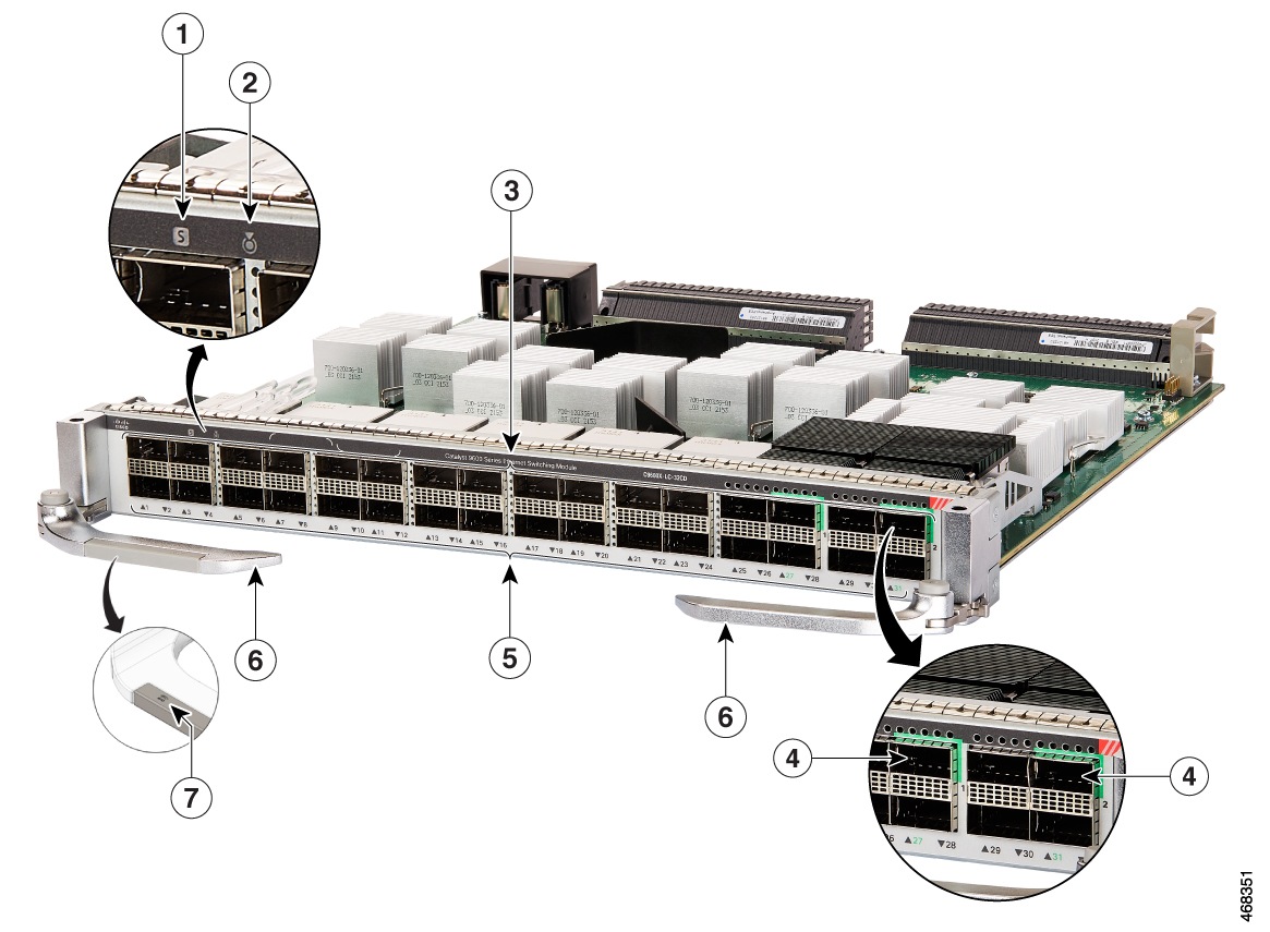 The following figure shows the front view of a Cisco Catalyst 9600 Series 30 ports of 100G/40G QSFP28, 2-port 400G QSFP-DD line card (C9600X-LC-32CD) with major features identified.