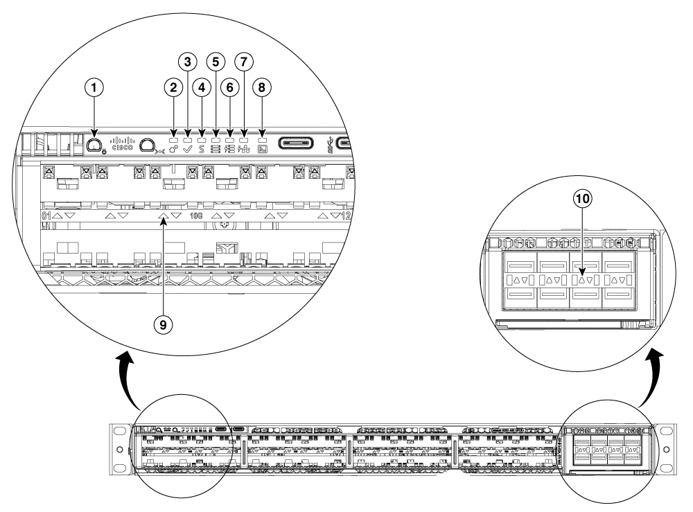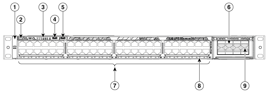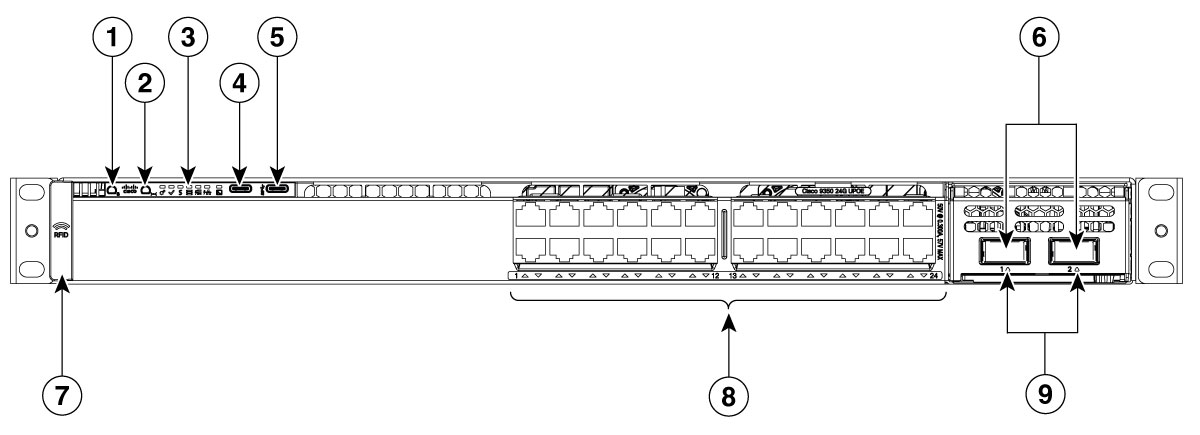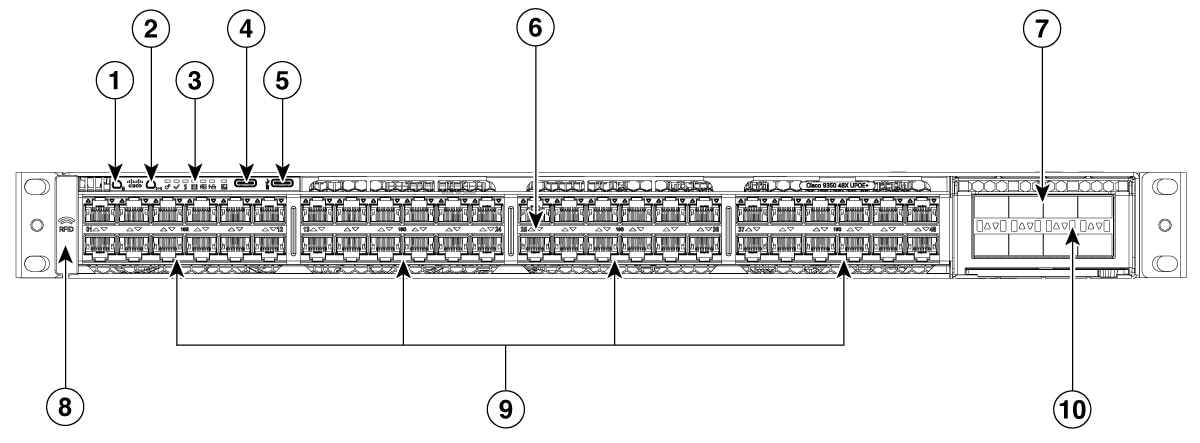This section describes the front-panel components of the Cisco C9350 series smart switches. All the switch models have similar components.