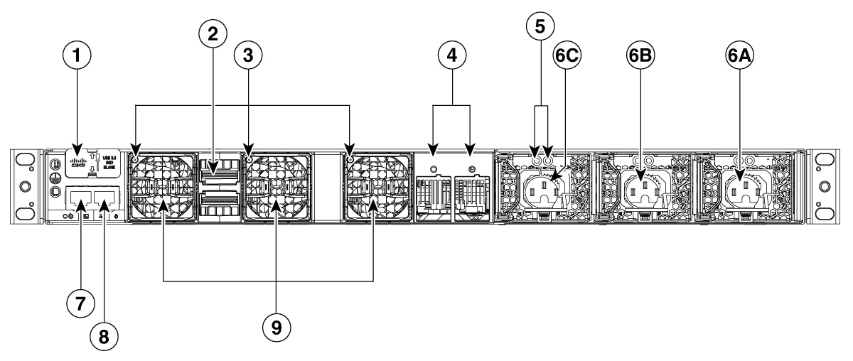 The Cisco C9350 series smart switches have three fan modules at the rear of the switch. The fans are hot-swappable and numbered from left to right.