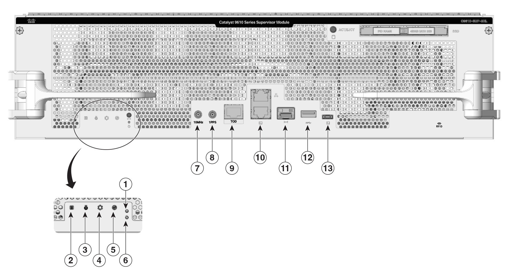 This table describes the ports and LEDs available on the supervisor engine modules of Cisco C9610 Series Smart Switches.