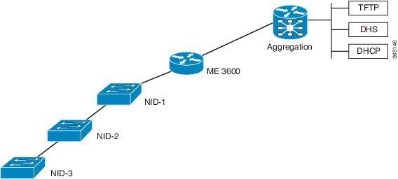 If the network topology involves one or more Cisco ME 1200 NID downstream from the Cisco ME 1200 NID connected to ME 3600 , the following steps are required to ensure ZTP works as expected. In this case, each Cisco ME 1200 NID is connected to the upstream Cisco ME 1200 NID through a point-to-point link.