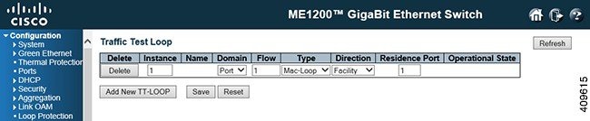The Traffic Test feature available on the ME 1200 Web GUI allows you to configure Traffic Test Loop instances for the ME 1200 switch.
