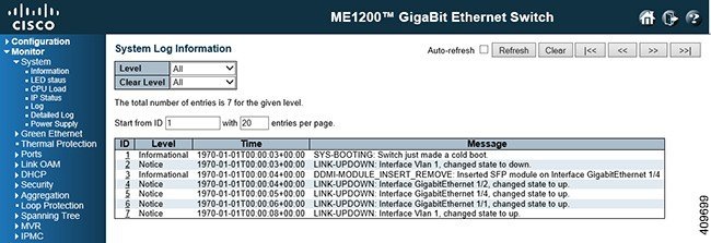 Each page shows up to 999 table entries, selected through the entries per page input field. When first visited, the web page will show the beginning entries of this table. The Level input field is used to filter the display system log entries. The Clear Level input field is used to specify which system log entries will be cleared. To clear specific system log entries, select the clear level first then click the Clear button.