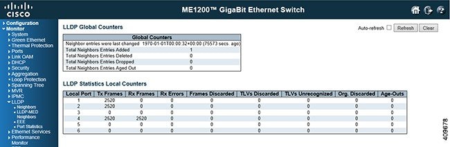 Frames Discarded: If a LLDP frame is received on a port, and the switch's internal table has run full, the LLDP frame is counted and discarded. This situation is known as Too Many Neighbors in the LLDP standard. LLDP frames require a new entry in the table when the Chassis ID or Remote Port ID is not already contained within the table. Entries are remove from the table when a given port's link is down, an LLDP shutdown frame is received, or when the entry ages out.