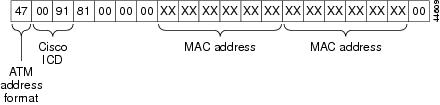 The first byte (47) of the default address identifies the address as an International Code Designator (ICD) ATM End Station Address (AESA). The second and third bytes (0091) are the globally unique ICD assigned to Cisco, and the next four bytes (81000000) are identical for all MGX 8850 switches. The unique portion of the default node address is the 6-byte MAC address, which is used in bytes 8 through 13 and again in bytes 14 through 19. Byte 20, which is the selector byte, is set to 00 by default.