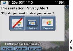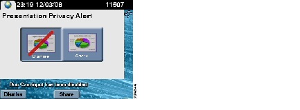 To prevent your presentation device input from being shared automatically if that input is active prior to the beginning of a Cisco TelePresence call, a Presentation Privacy alert is displayed at the beginning of a call, and you can select whether to share or dismiss the presentation.