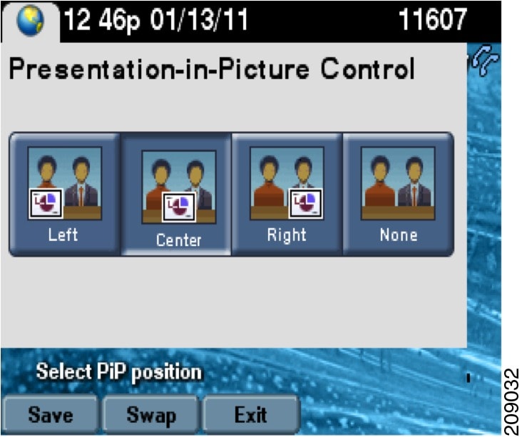 You can choose to have your Presentation-in-Picture (PiP) display appear larger on-screen than the video image of the meeting attendees by touching the Swap softkey in the Presentation-in-Picture Control screen of the CTS phone (Figure 5-11). You can easily toggle back to a larger video image with a smaller display.