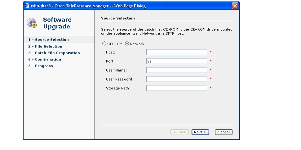 This task upgrades the Cisco TelePresence Manager software by loading a file from either a CD-ROM or an SFTP host network. Before starting this task, find out the source of the patch file.