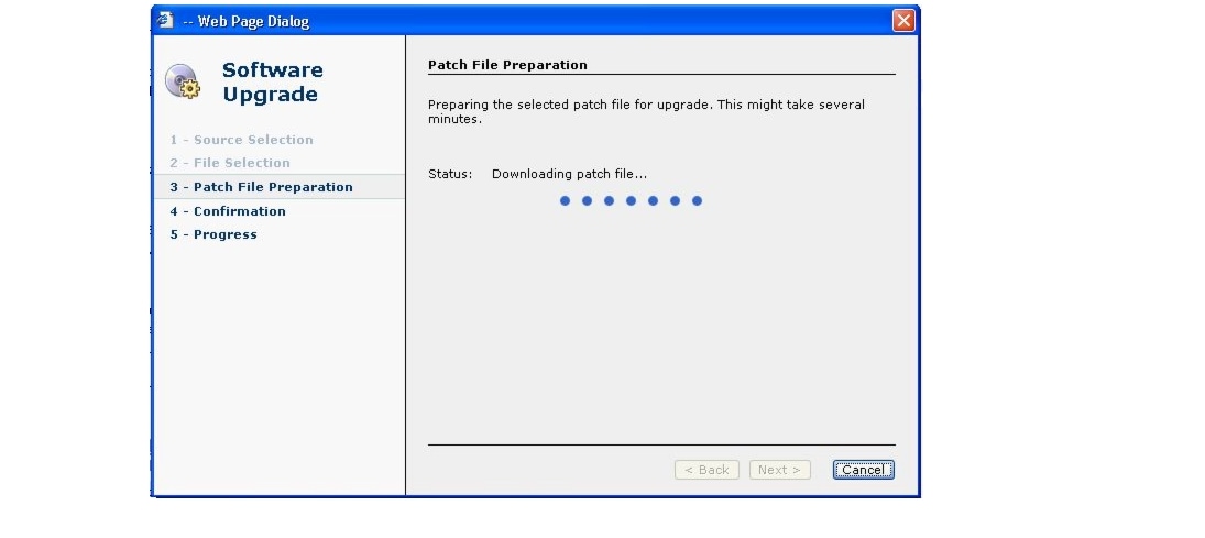 The Patch File Preparation window appears. Watch this window to monitor the progress of the file download. Buttons will be inactive until the patch file is loaded.
