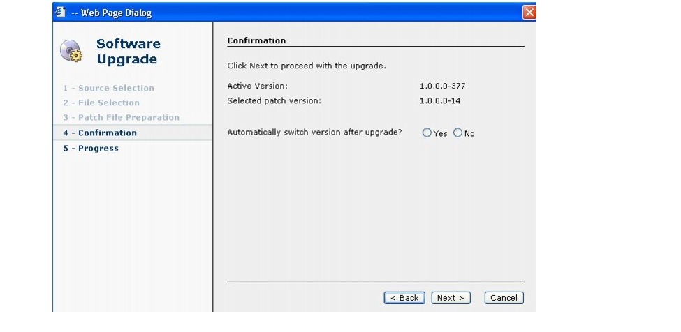 The software wizard displays the software versions that are installed and provides active Yes and No radio buttons so you can choose to switch the newly loaded software to the active partition.