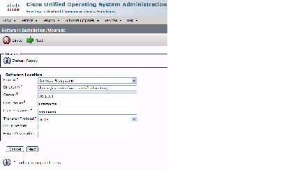 Step 7 Click Next . Unified CM accesses the SFTP server. The Software Location area lists the COP files that Unified CM finds in the directory that you specified.