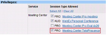 Each Cisco WebEx user account has a corresponding set of Session Type check boxes that indicate which Cisco WebEx session types have been enabled for that user; “Meeting Center TelePresence” is one of the “PRO” sessions types. (Other session types, such as Meeting Center Pro meeting, can also have a “PRO” headline, as shown in Figure 10-2.)