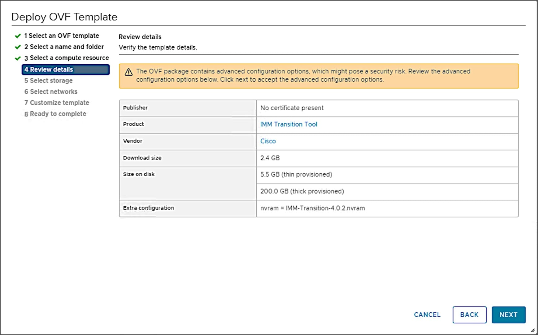 An Open Virtual Appliance (OVA) is a prebuilt software solution that comprises one or more virtual machines (VMs) that are packaged, maintained, updated, and managed as a single unit. The Cisco Intersight Managed Mode Transition Tool OVA has a preinstalled operating system and includes application functionality that is necessary for the IMM Transition Tool functionality. The IMM Transition Tool as an OVA can be deployed on a VMware vSphere infrastructure.