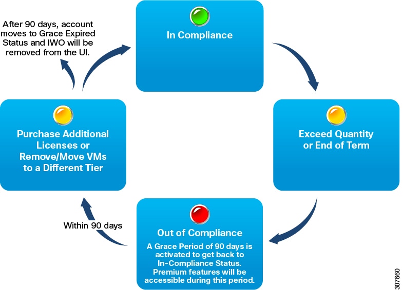When an account license status moves to Out of Compliance, a Grace period of 90 days is triggered. In this period, you can continue to use the premium features, but the account license status remains Out of Compliance. To get back in compliance, you must purchase additional licenses or remove a VM/Workload from the existing tier or move it to a lower tier. If you do not renew your license within the 90 days, the license state moves to Grace Expired and the license is downgraded to Base-level functionality and the premium features become unavailable. You must register a valid license again to resume using the features. For example, if an account has a valid license for 20 VM/Workloads and if you claim another VM/Workload into the account, the status moves to Out of Compliance and the grace period is initiated. However, you can continue to access the features as before. To restore the In Compliance status, you can move one of the VM/Workloads to a lower tier (Essentials/Advantage, as required).