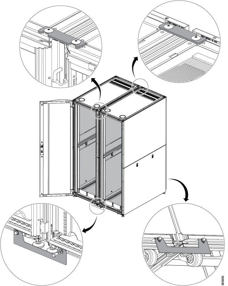 Attach the stabilizer brackets to the rear of the Cisco R42612 rack as shown in the following figure. ![]() |