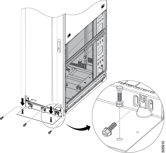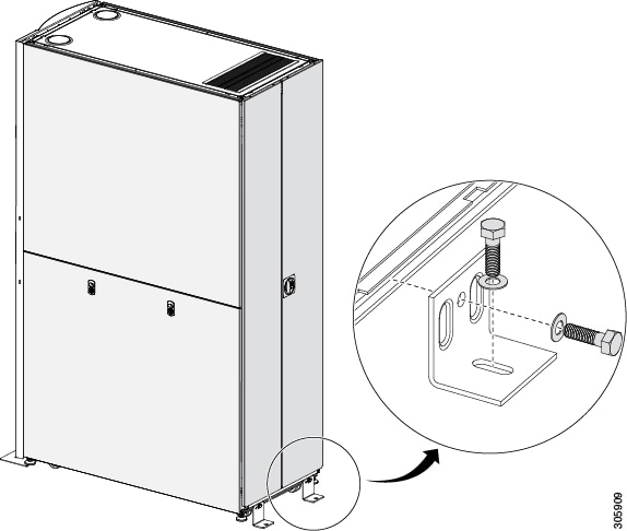 Bolt the Cisco R42612 rack to the floor surface through the holes in the front and rear stabilizer brackets. |