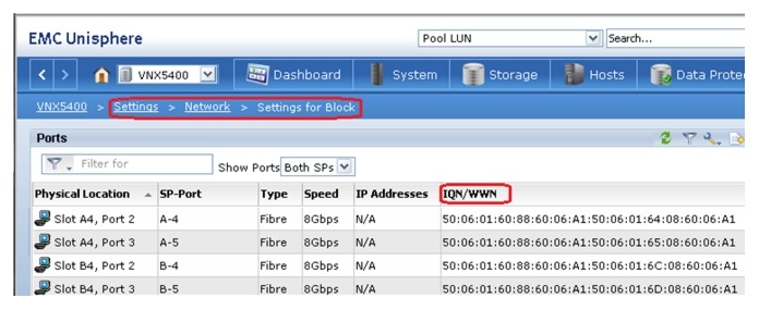 SP Port Relative Port Name WWNN WWPN A 0 A-12 50:06:01:60:88:60:06:A1 50:06:01:64:08:64:06:A1 1 A-13 50:06:01:65:08:64:06:A1 B 0 B-12 50:06:01:6C:08:64:06:A1 1 B-13 50:06:01:6D:08:64:06:A1