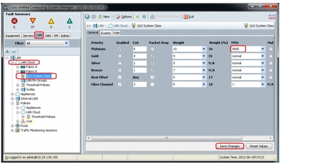 policy-map type qos system-qos-policyclass class-fcoeset qos-group 1exitexitpolicy-map type queuing system-queue-in-policyclass type queuing class-fcoebandwidth percent 75class type queuing class-defaultbandwidth percent 25exitexitpolicy-map type queuing system-queue-out-policyclass type queuing class-fcoebandwidth percent 75class type queuing class-defaultbandwidth percent 25exitexitpolicy-map type network-qos system-nwqos-policyclass type network-qos class-fcoepause no-dropmtu 2158class type network-qos class-defaultmtu 9000exitexitsystem qosservice-policy type qos input system-qos-policyservice-policy type queuing input system-queue-in-policyservice-policy type queuing output system-queue-out-policyservice-policy type network-qos system-nwqos-policyexitcopy running-config start-configshow running-config ipqosclass-map type qos class-fcoeclass-map type queuing class-fcoematch qos-group 1class-map type queuing class-all-floodmatch qos-group 2class-map type queuing class-ip-multicastmatch qos-group 2policy-map type qos system-qos-policyclass class-fcoeset qos-group 1class class-defaultpolicy-map type queuing system-queue-in-policyclass type queuing class-fcoebandwidth percent 75class type queuing class-defaultbandwidth percent 25policy-map type queuing system-queue-out-policyclass type queuing class-fcoebandwidth percent 75class type queuing class-defaultbandwidth percent 25class-map type network-qos class-fcoematch qos-group 1class-map type network-qos class-all-floodmatch qos-group 2class-map type network-qos class-ip-multicastmatch qos-group 2policy-map type network-qos jumboclass type network-qos class-defaultmtu 9000multicast-optimizepolicy-map type network-qos system-nwqos-policyclass type network-qos class-fcoepause no-dropmtu 2158class type network-qos class-defaultmtu 9000multicast-optimizesystem qosservice-policy type qos input system-qos-policyservice-policy type queuing input system-queue-in-policyservice-policy type queuing output system-queue-out-policyservice-policy type network-qos system-nwqos-policyVLANs