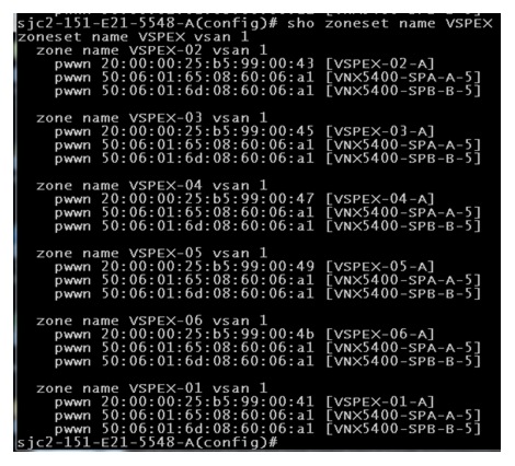 Device Port WWPN WWNN VSPEX-01 Fabric A Fabric B VSPEX-02 Fabric A Fabric B VSPEX-03 Fabric A Fabric B VSPEX-04 Fabric A Fabric B VSPEX-05 Fabric A Fabric B VSPEX-06 Fabric A Fabric B