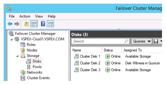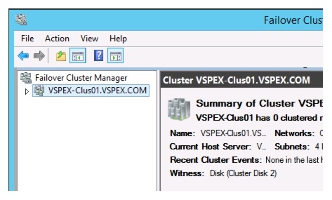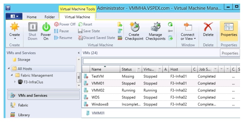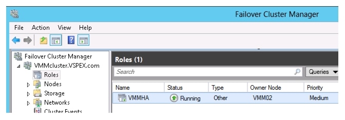 Log into the first VMM virtual machine. Using the Failover Cluster Manager console, move the highly available VMM role to the first VMM virtual machine.