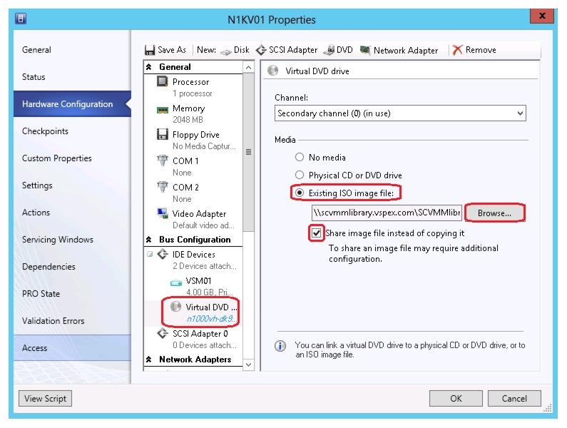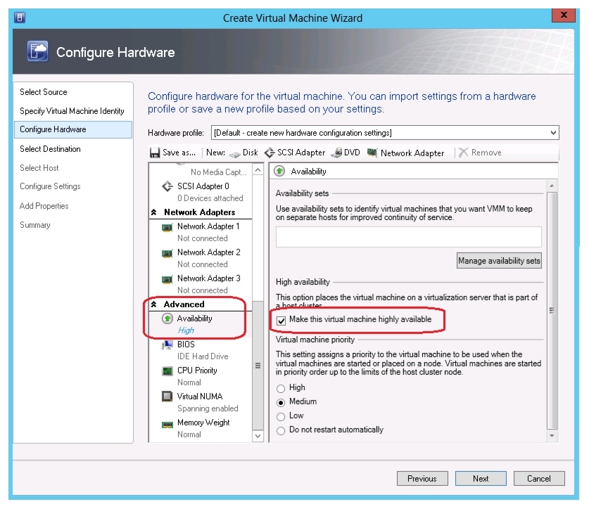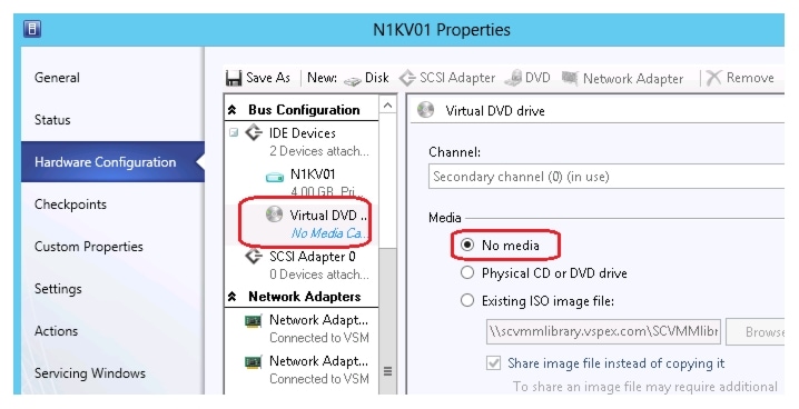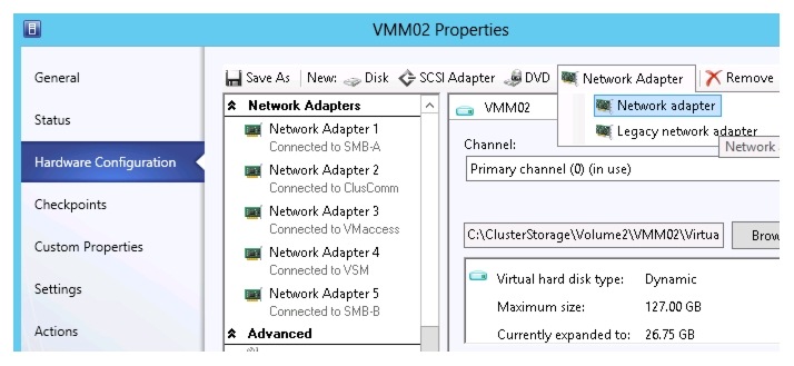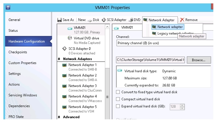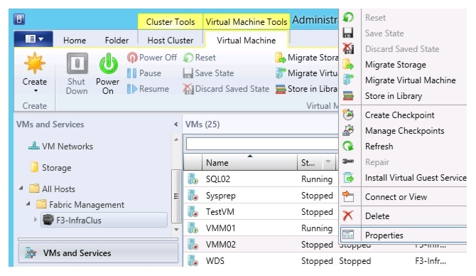 Start the VMM console and select VMs and Services. Expand All Hosts. Right-click the stopped VMM virtual machine and select Properties.