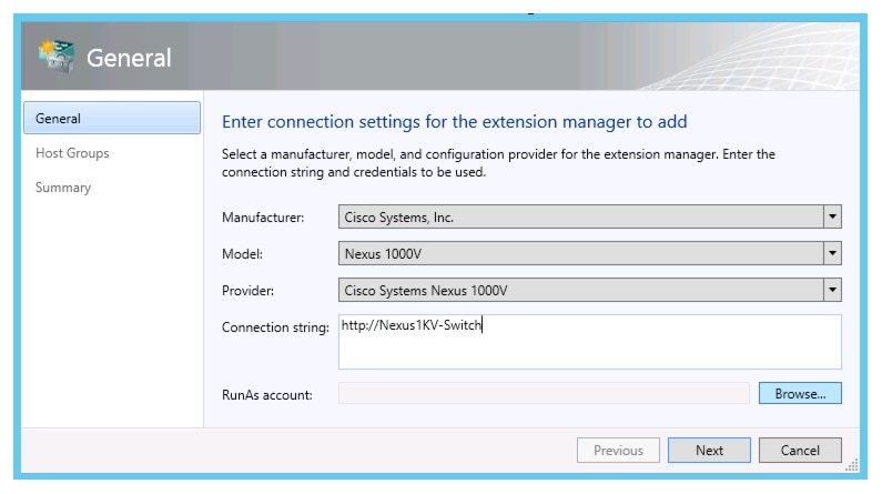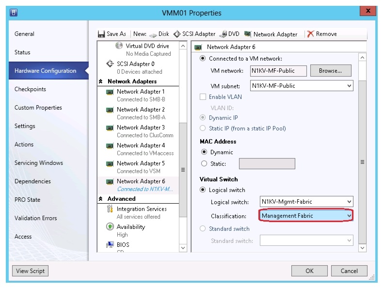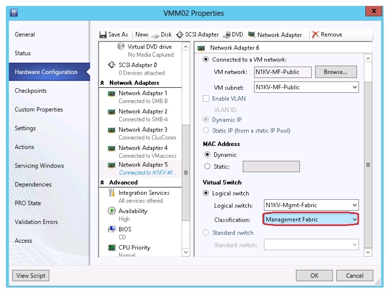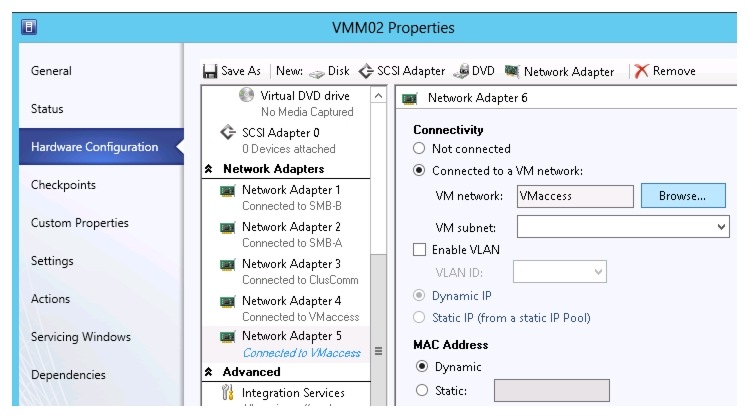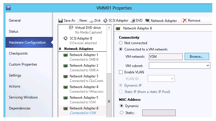 This example shows how to add the network managed by the Nexus 1000V to the VMM virtual machines. The same procedure would be used to add network adapters on this managed network to other virtual machines.