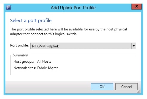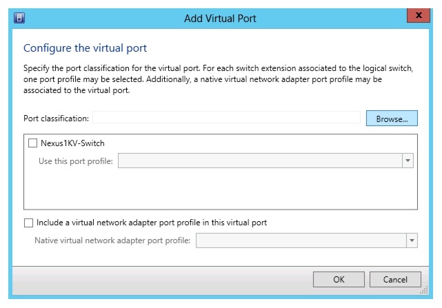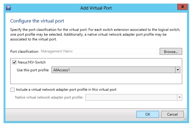 Back in the Configure the virtual port dialog window, select the check box by your virtual switch, and select the port profile created earlier from the drop-down box.