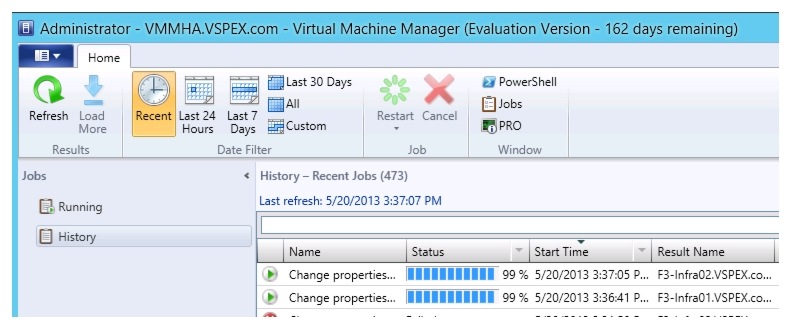 When you see the role has successfully moved to the other node, shutdown the first VMM virtual machine by running following PowerShell command: