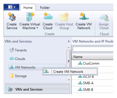 In the Virtual Machine Manager console, select VMs and Services. Right-click VM Networks and select Create VM Network.