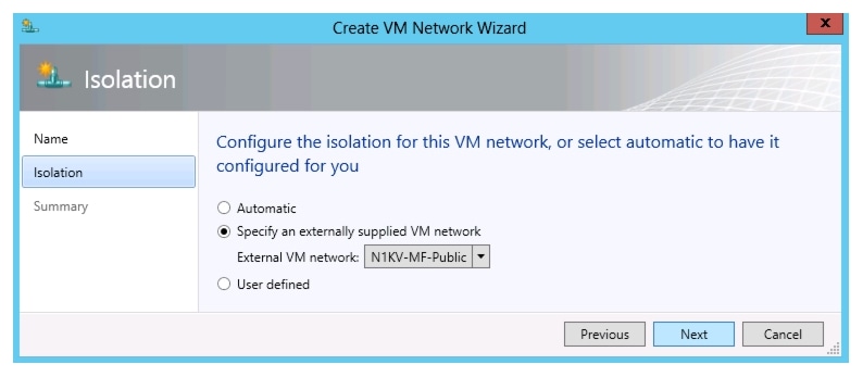 In the Isolation dialog window, click the radio button by Specify an externally supplied VM Network. From the drop-down list for External VM network, select the network segment defined when configuring the VSM.
