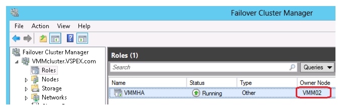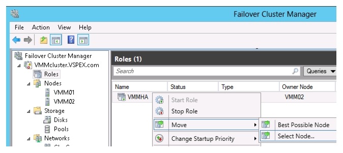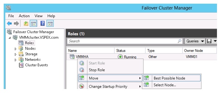 Login to the first Virtual Machine Manager virtual machine. Using Failover Cluster Manager console, identify the owner of the highly available Virtual Machine Manager instance. Move the Virtual Machine Manager instance to the second node, if it is owned by the first node, by right-clicking on the role, selecting Move > Best Possible Node.