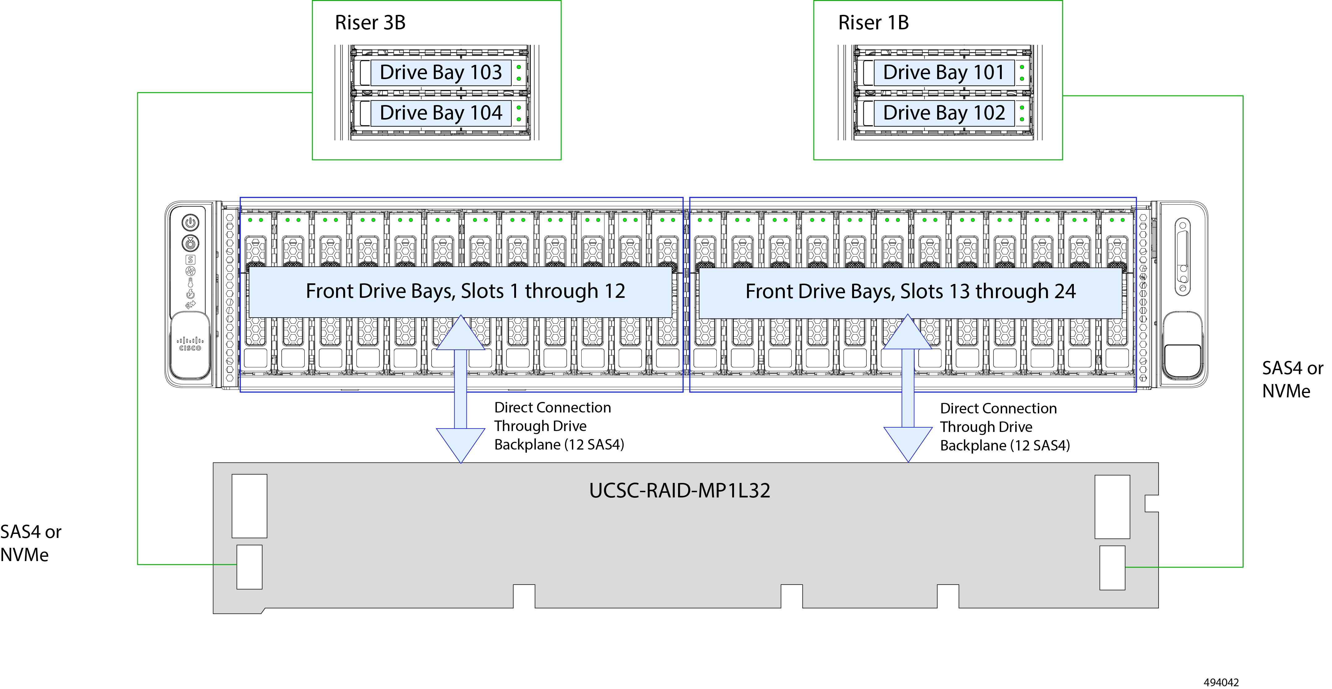 24 Front-loading HDDs: Up to 24 SAS drives (Gen4, 24 Gbps). No direct-attach NVMe drive support. Plus, Rear-loading HDDs: up to 4 SAS HDDs (Gen4, 24 Gbps) or up to 4 Gen4 x4 NVMe drives. Two controllers, each manages 14 drives Controller 1: Slots 1-12 plus 103 and 104 Controller 2: Slots 13-24 plus 101 and 102 |