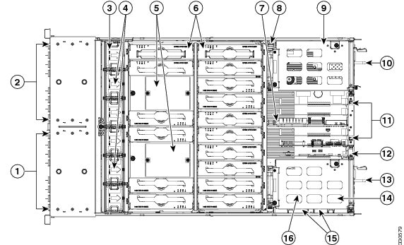 This section shows the locations of the components that are discussed in this chapter. The view in Figure 3-5 is from the top down with the top cover removed.