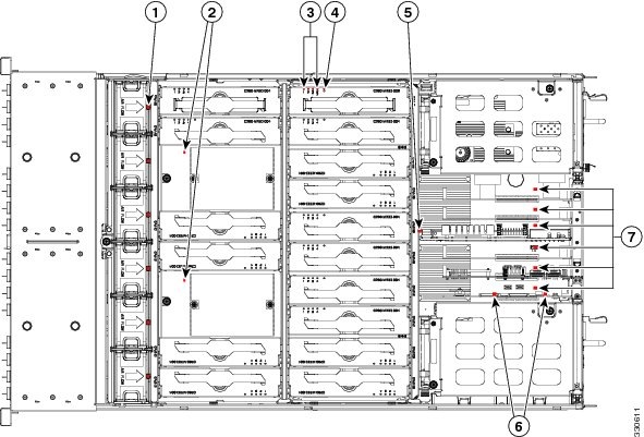 The server has internal fault LEDs for fan modules, CPU sockets, DIMMs, memory risers, the motherboard RTC battery, PCIe sockets, and Cisco FlexFlash cards.
