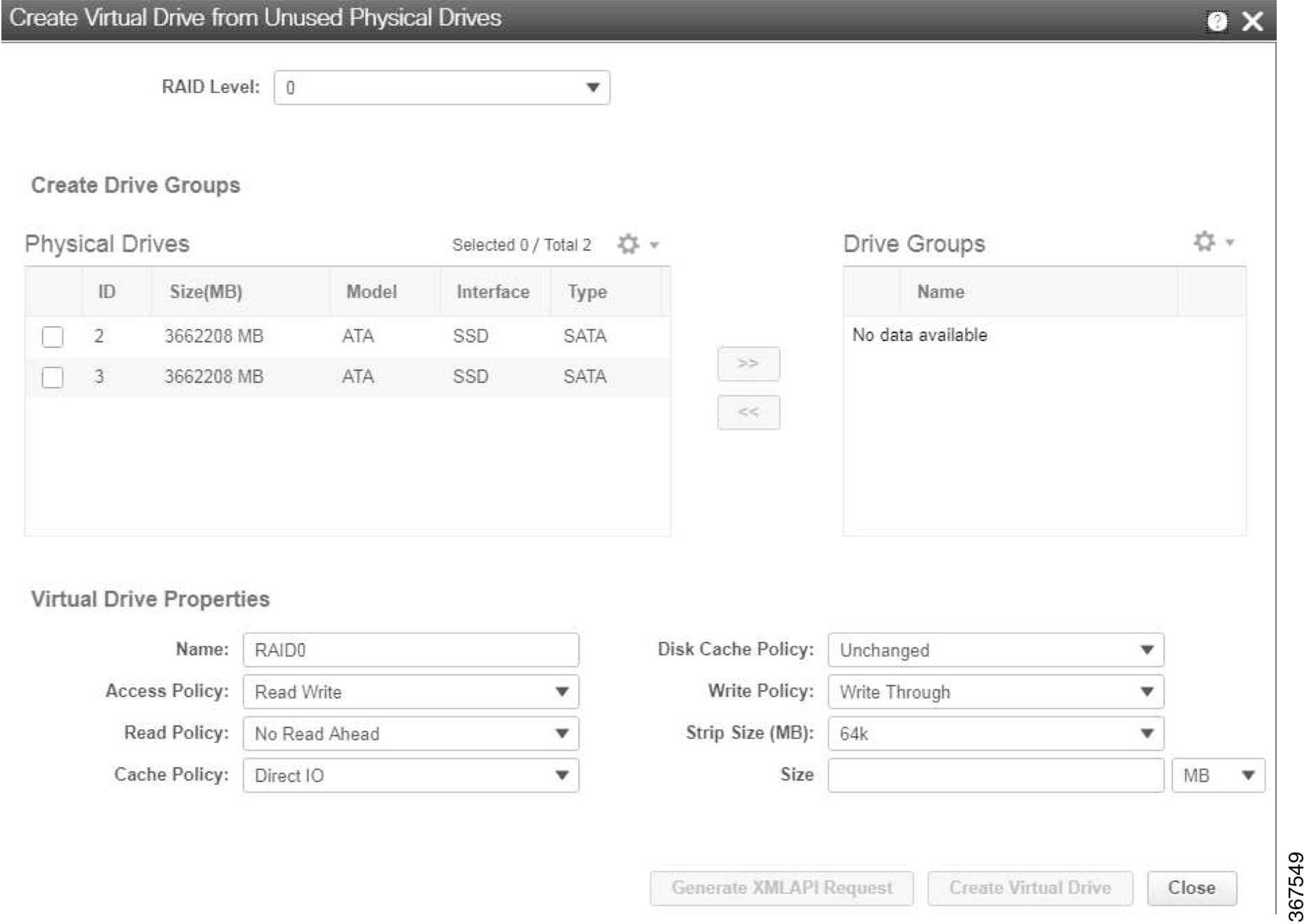 In the Actions area of the Virtual Drive Info tab, click Create. The Configure Virtual Drive dialog box appears. Configure Virtual Drive Dialog Box