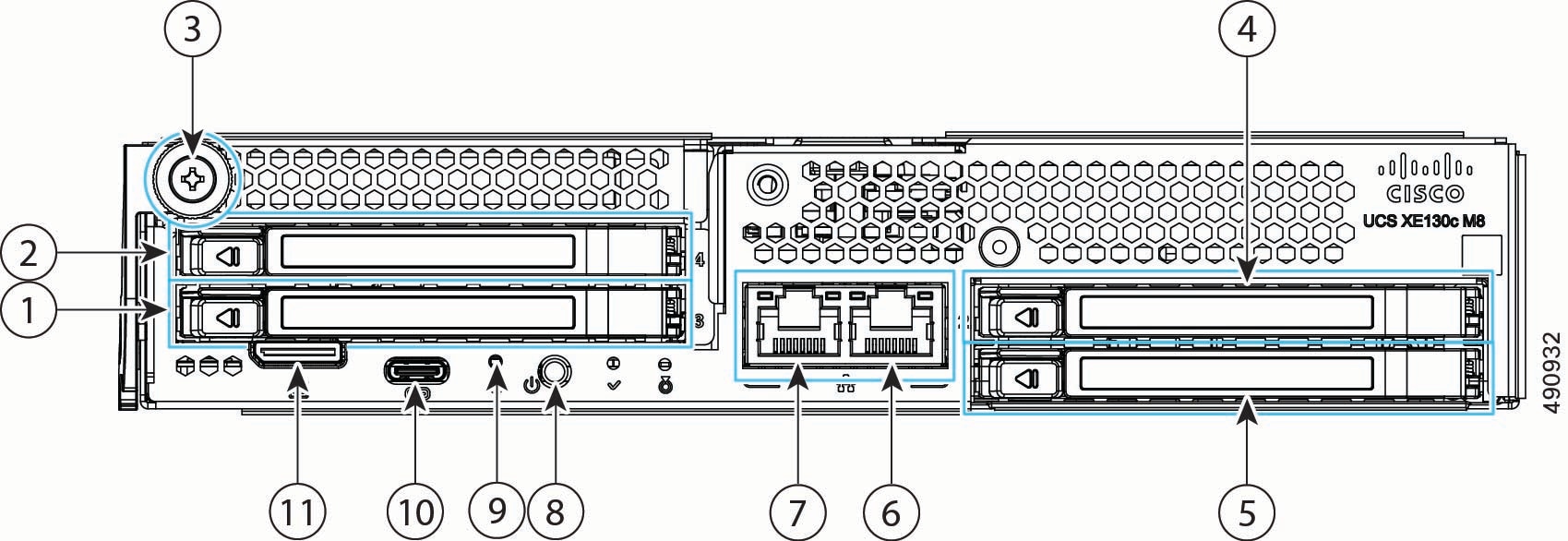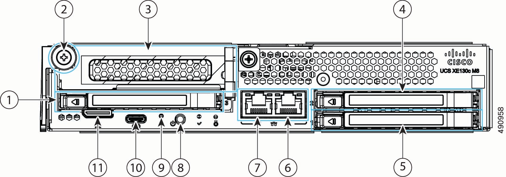 The front panel of the Cisco UCS XE9305 modular system contains the following hardware features.