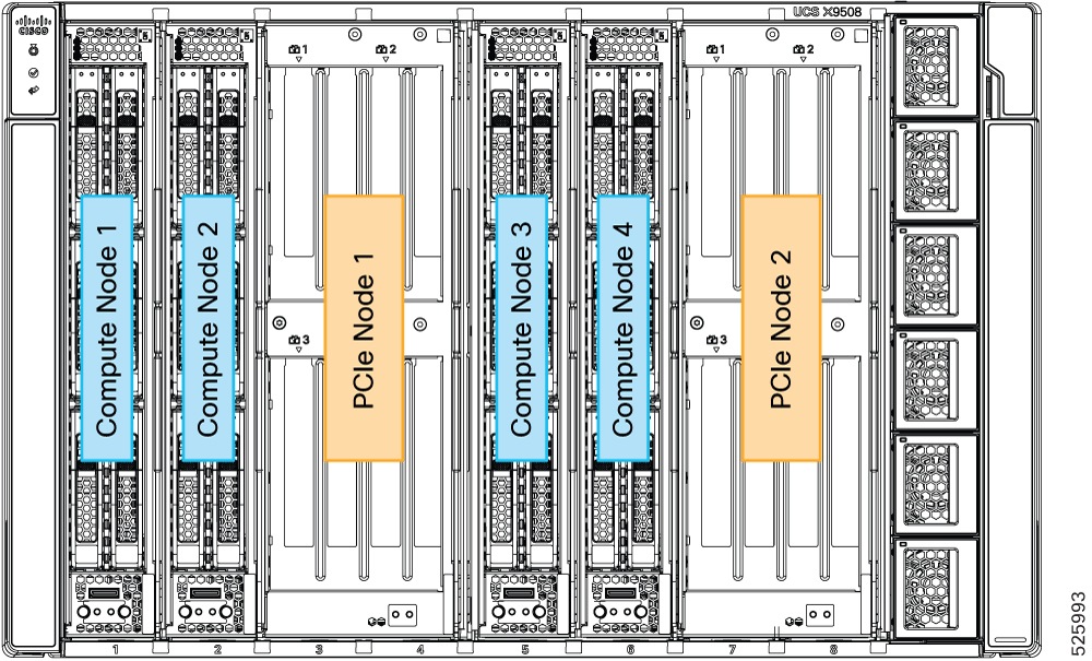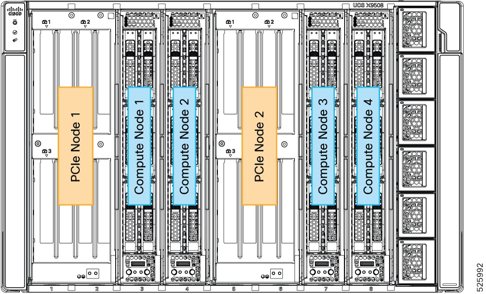 In this configurations, the PCIe node is installed in slots 1/2 and 5/6, and the M8 compute nodes are supported in slots 3/4 and 7/8.