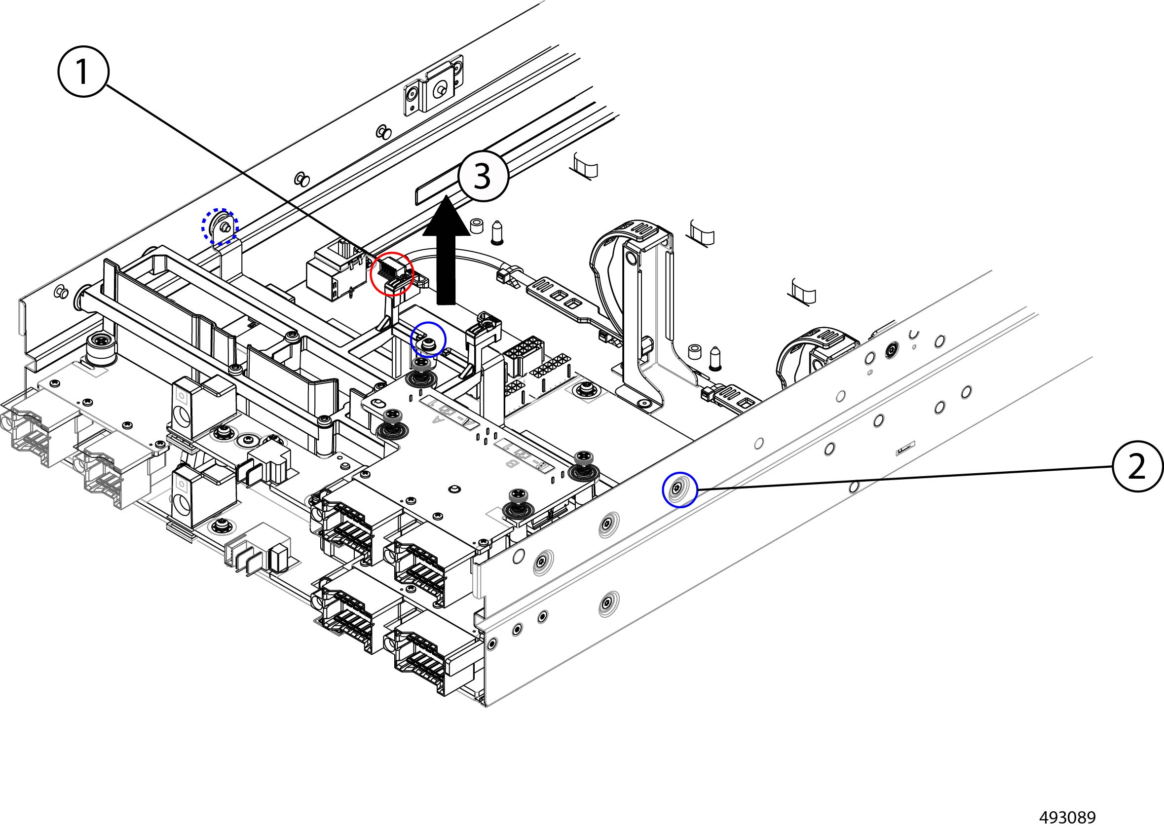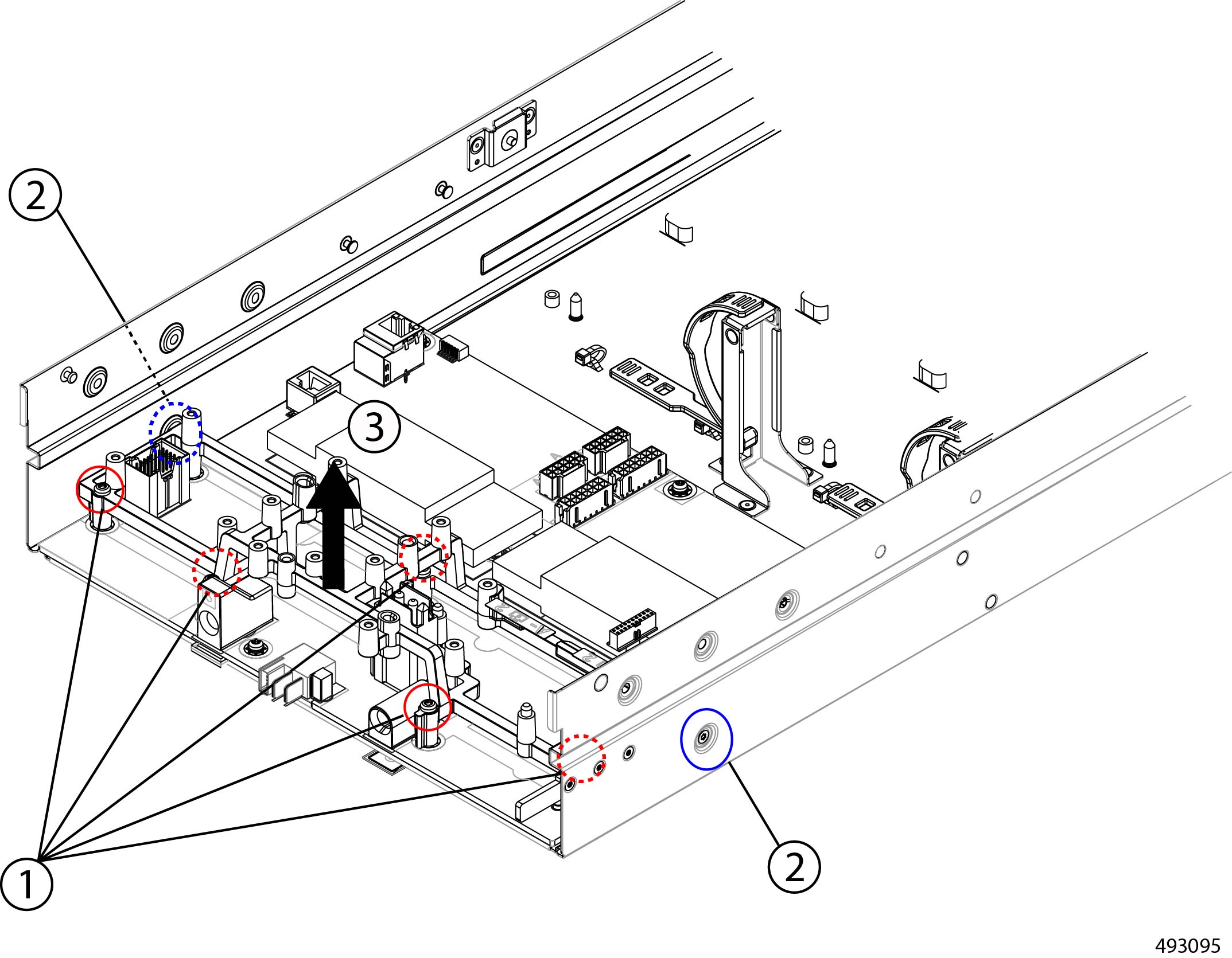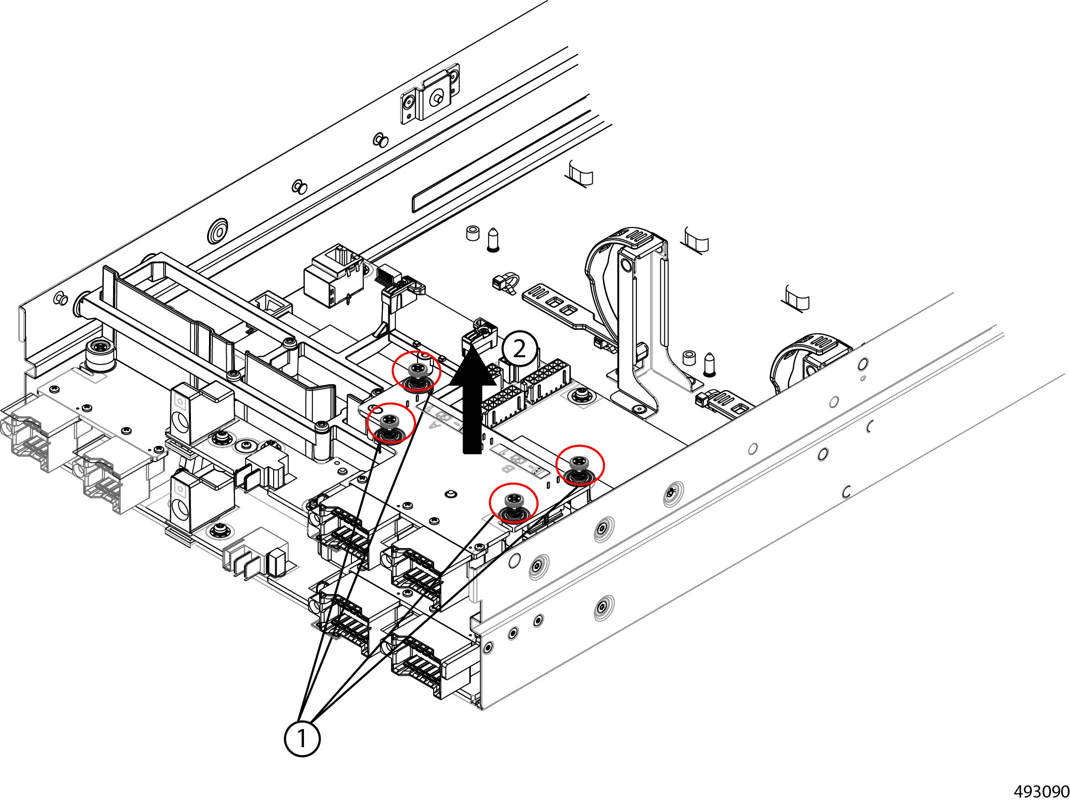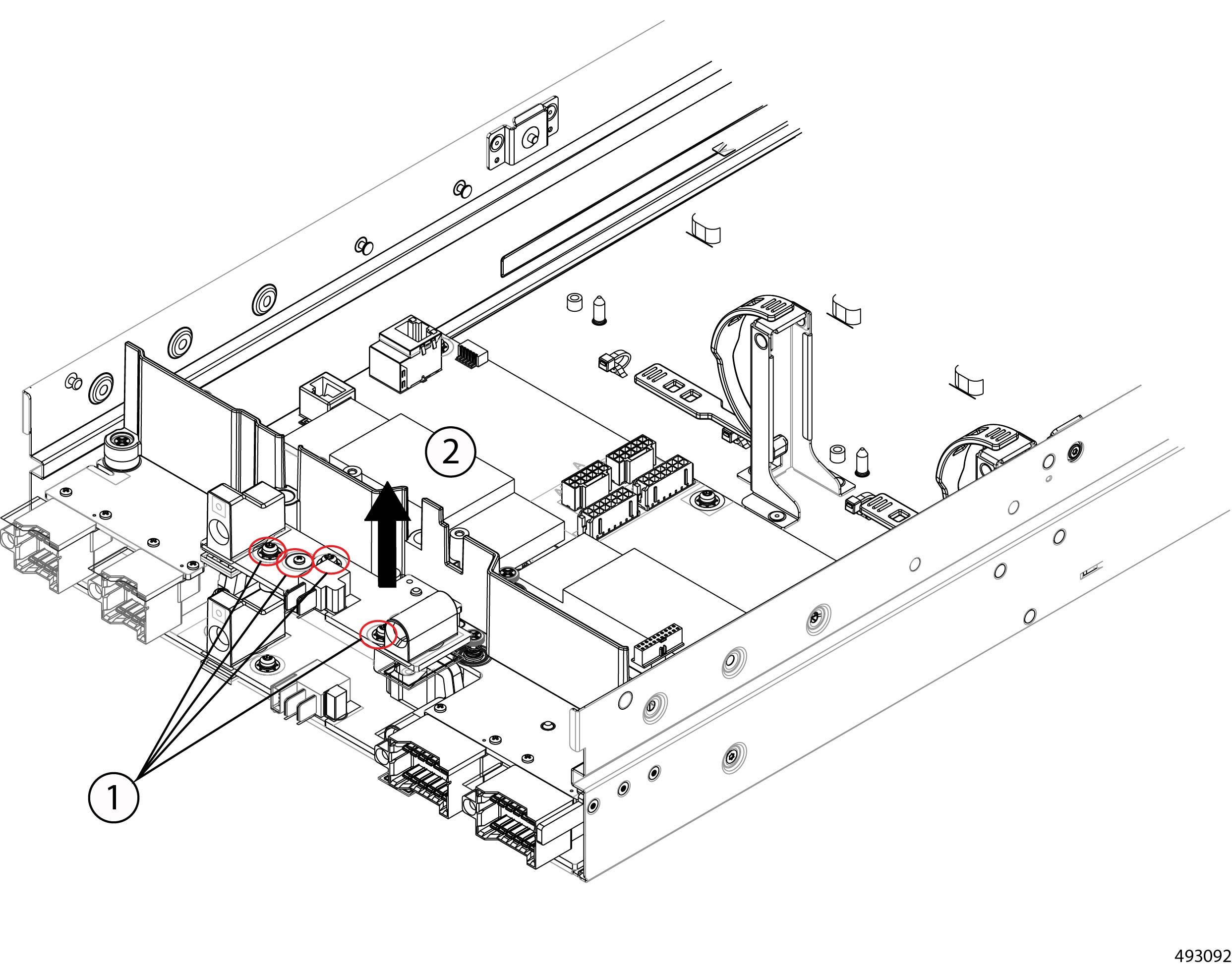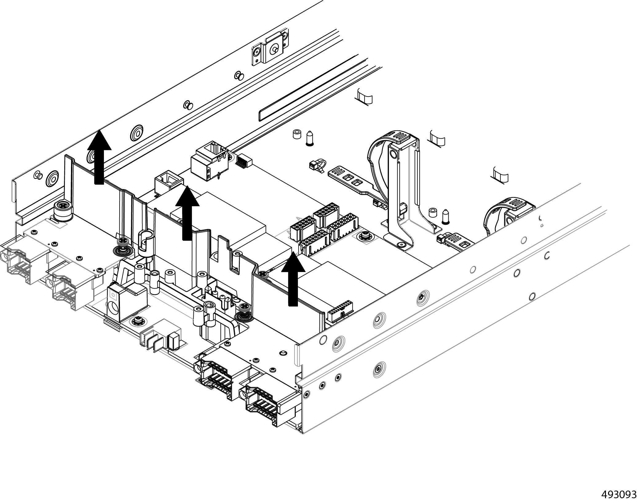 The node's PCB is located at the rear of the node. You will find it helpful to remove the GPU cages before attempting this procedure. When the GPU cages are removed, you will have ample space to work on the node's PCB.