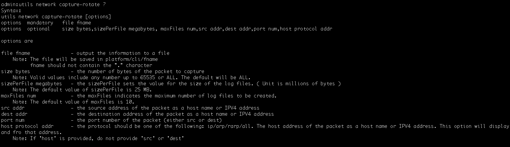 admin:utils network capture-rotate file mycapturename maxFiles 2maxFiles num - the maxFiles indicates the maximum number of log files to be created. The default value of maxFiles is 10.